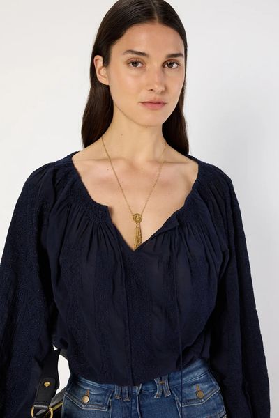 Embroidered blouse with round neckline and tie fastening for hippy chic style. Made from fine, navy blue cotton blend voile with a slight transparency.