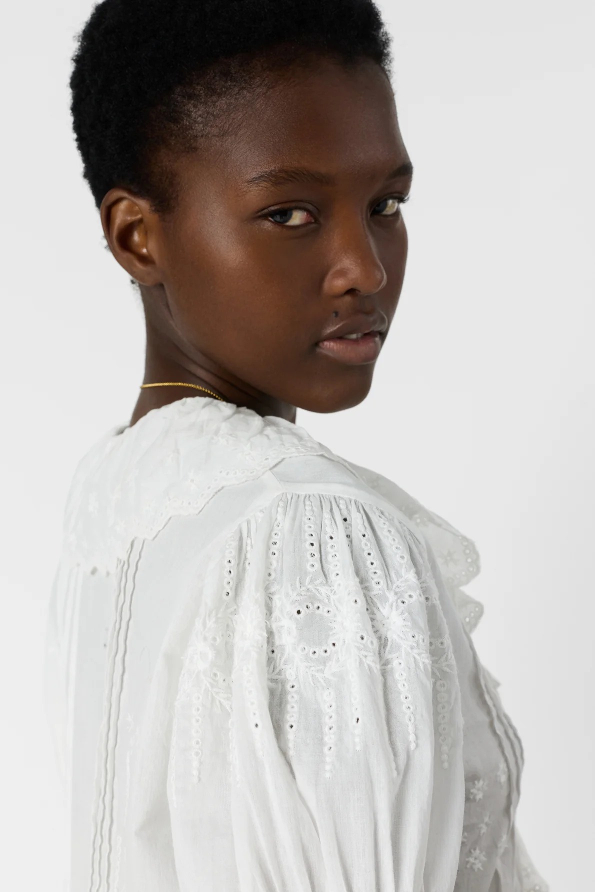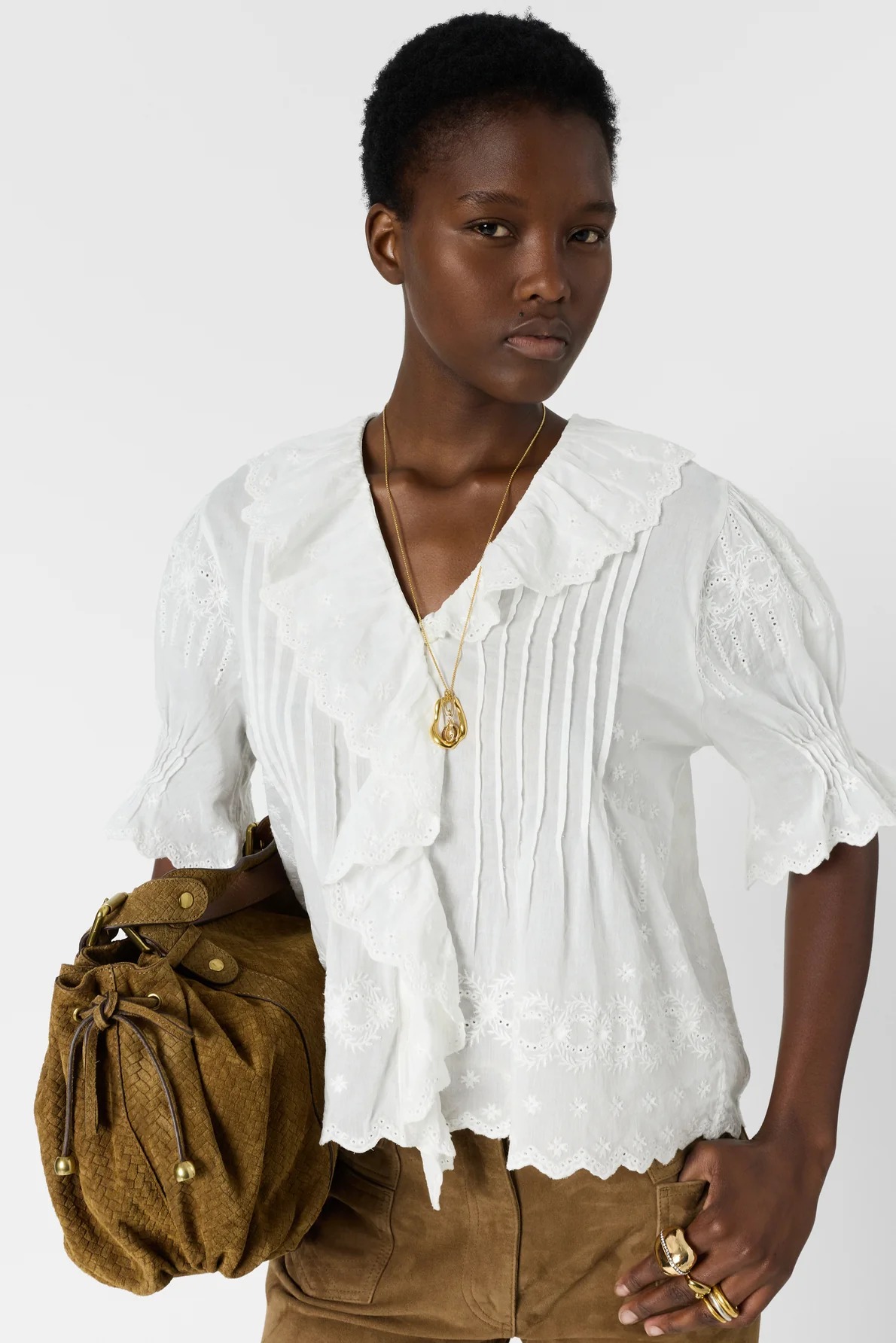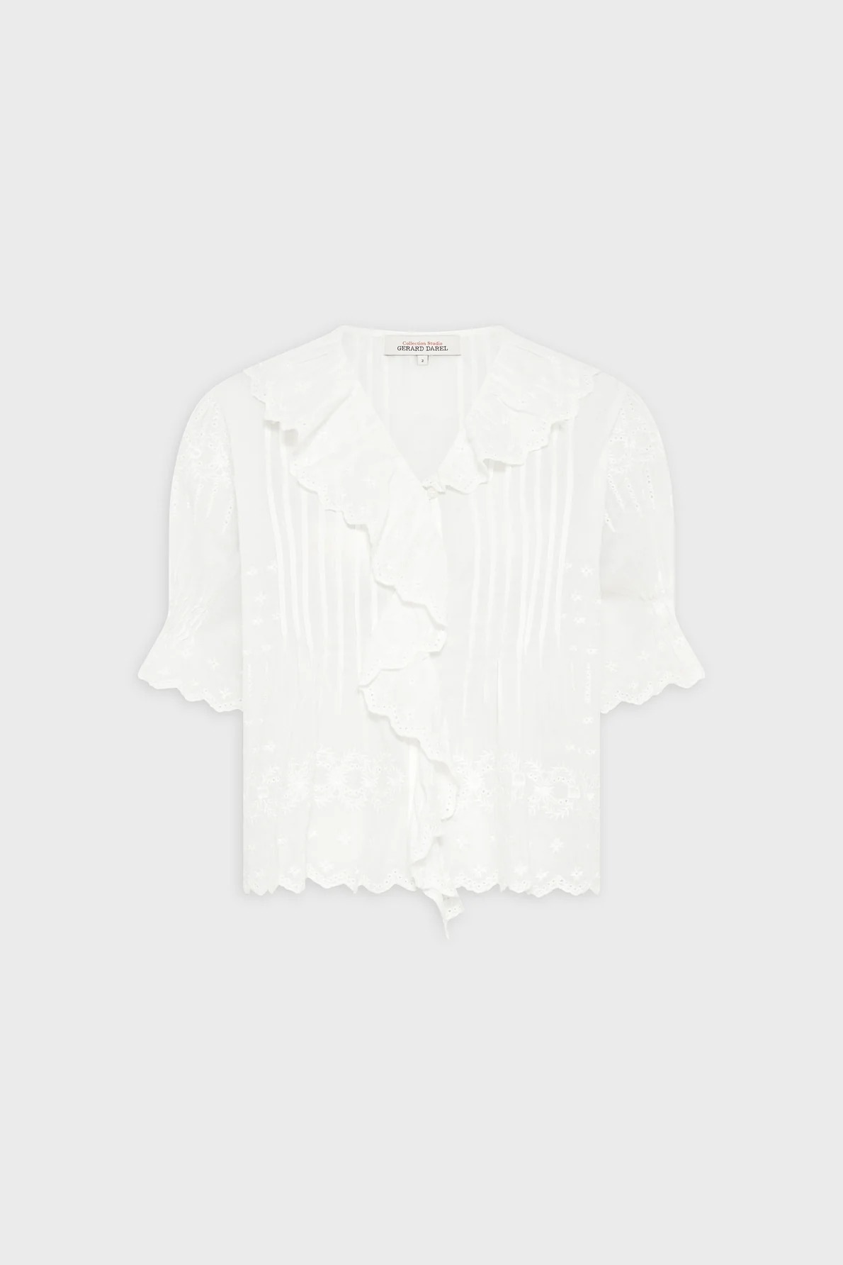 This embroidered shirt in white cotton voile is enhanced by a scalloped ruffle that frames the neckline. Its tone-on-tone embroidery offers a bohemian and refined look, while its pleats structure the silhouette. 100% cotton.