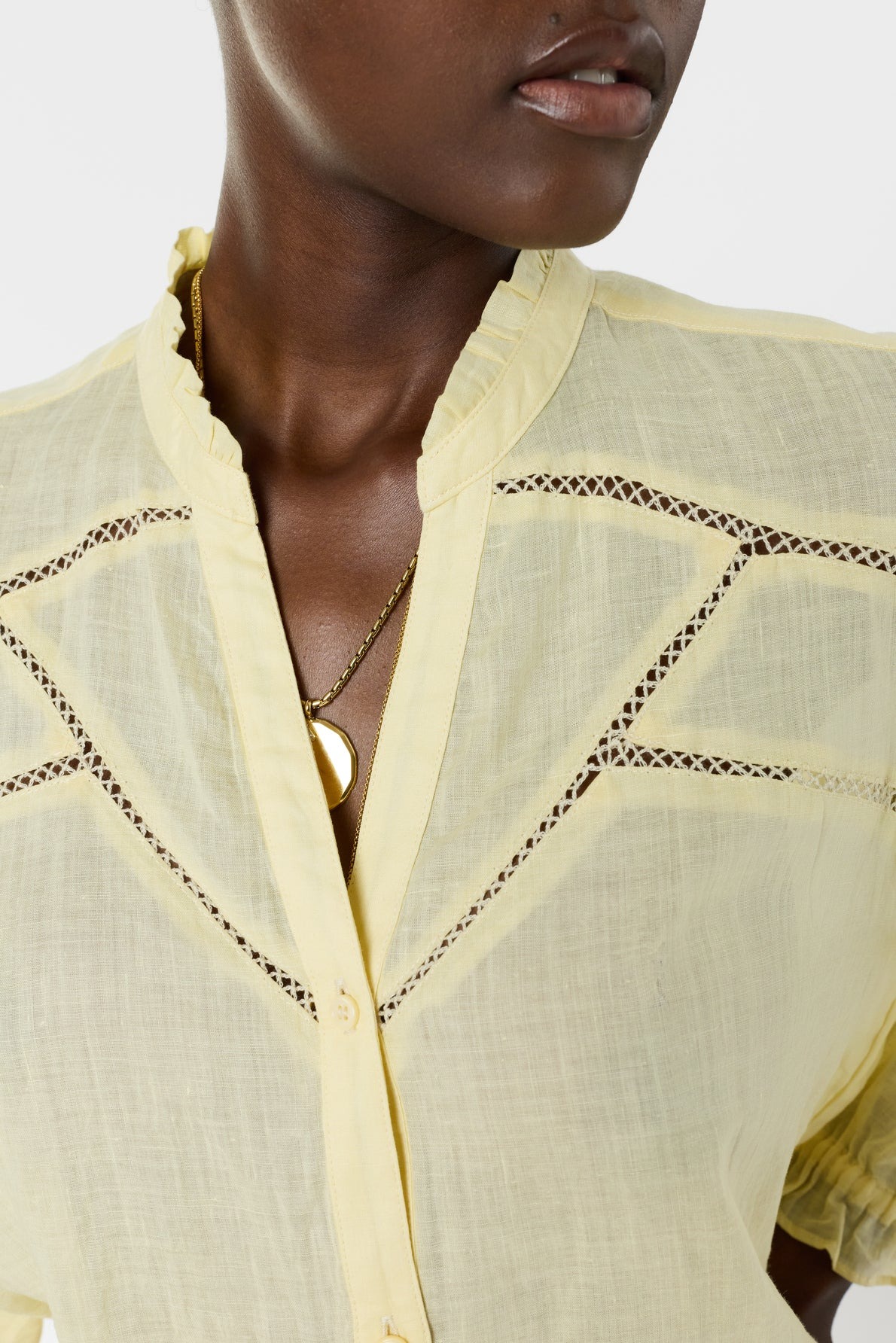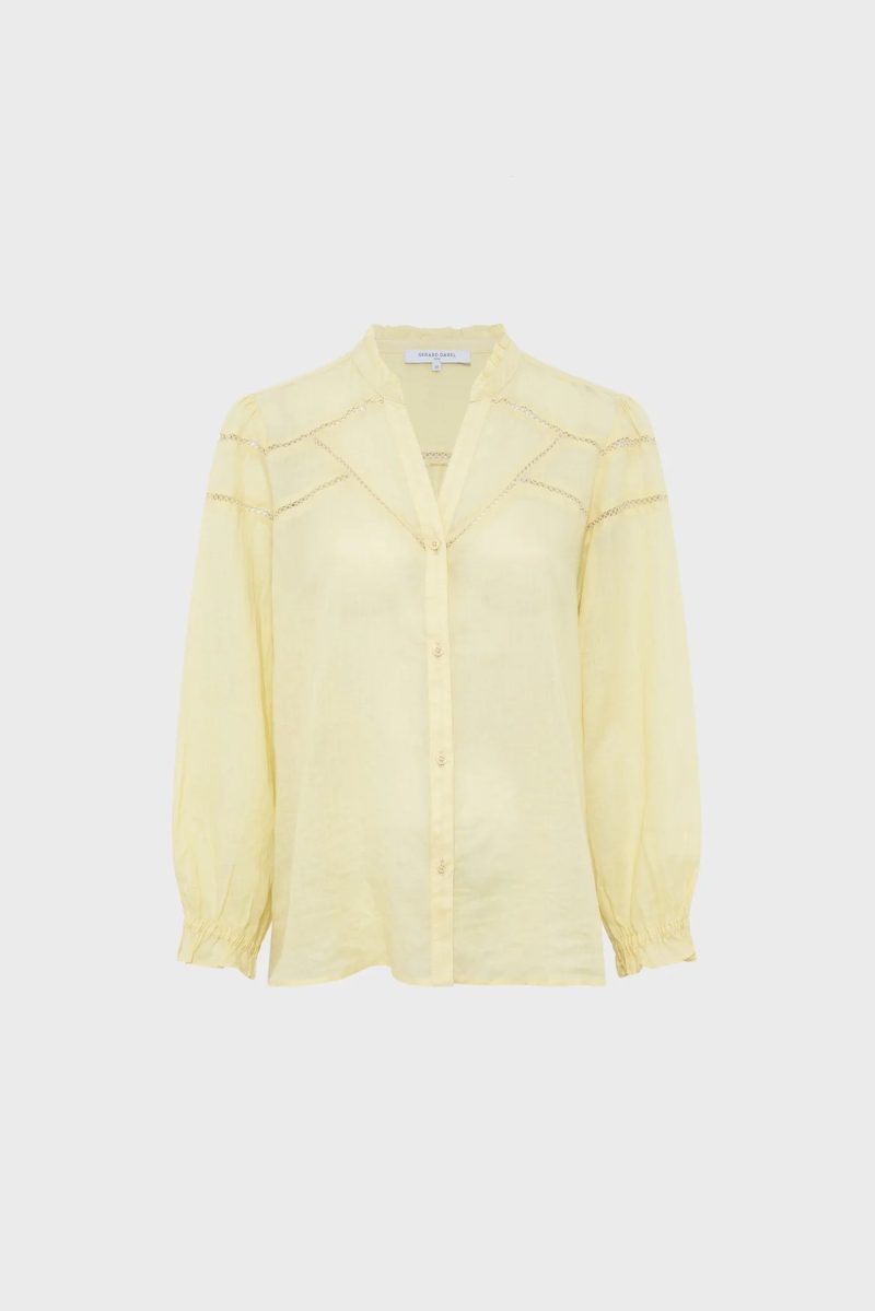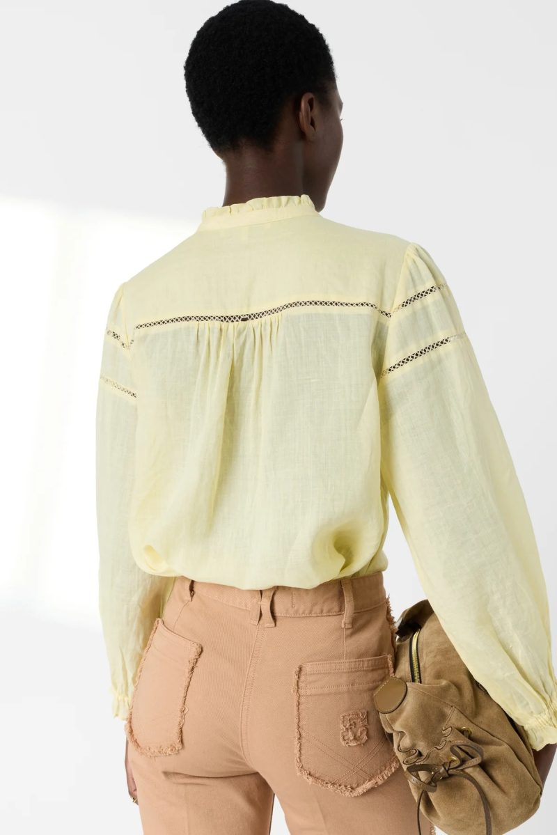 This shirt will captivate with its fine fabric with subtle transparency, its delicate openwork embroidery and its yellow color which will enhance tanned complexions.