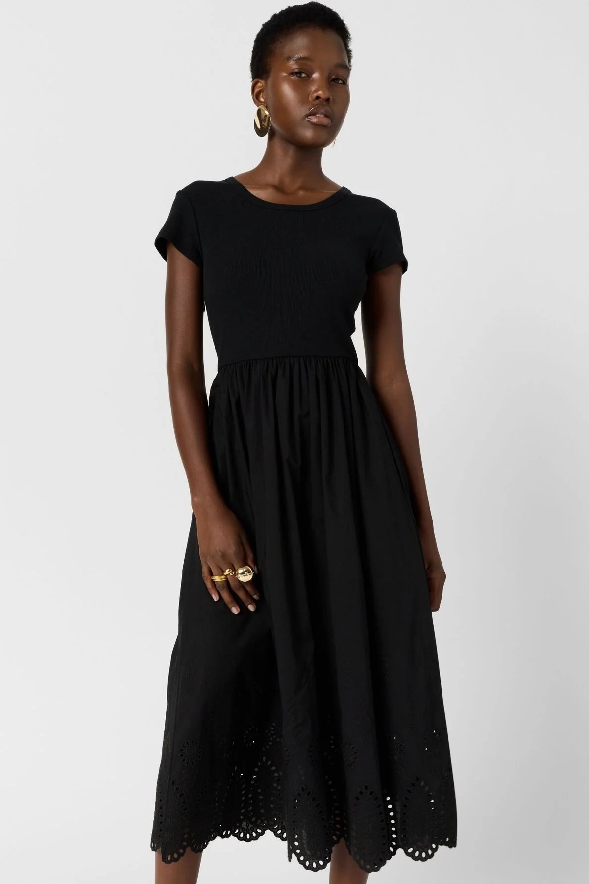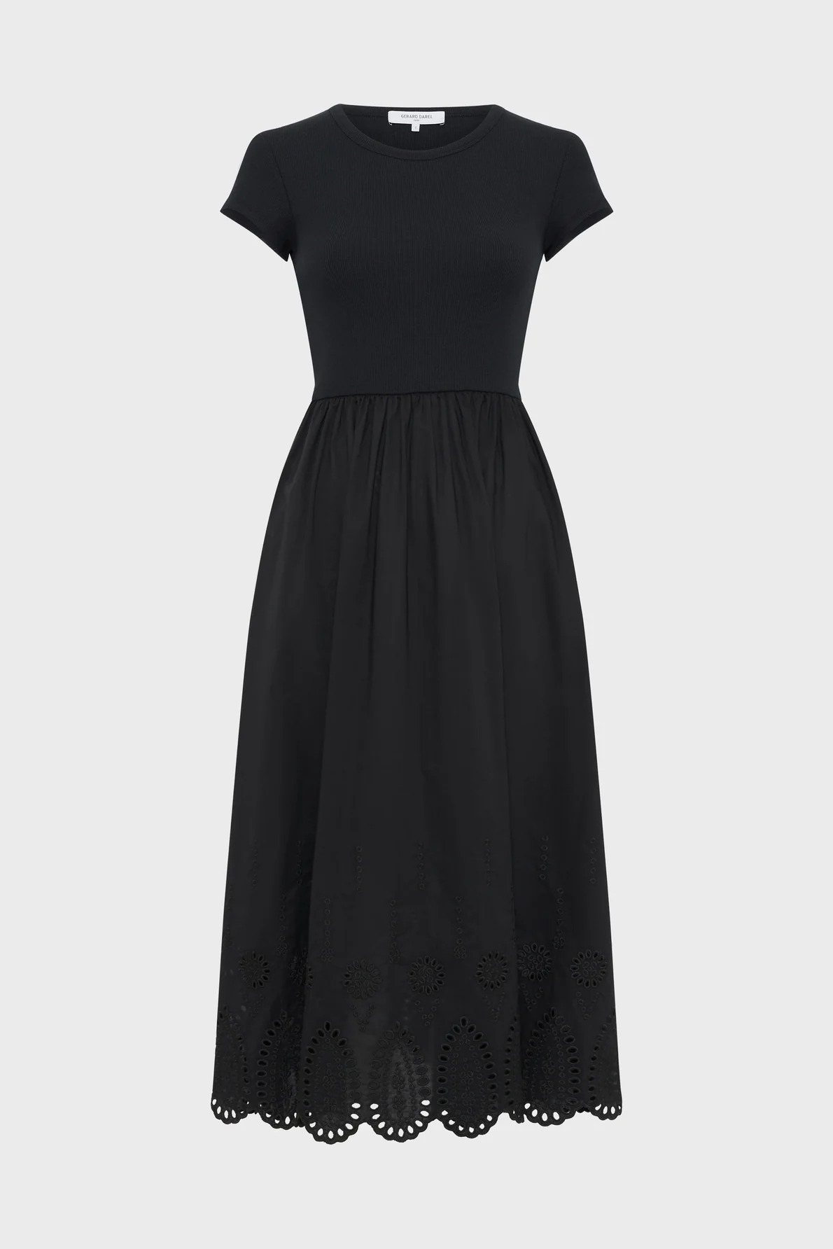 Black long bi-material dress, featuring a thin-ribbed t-shirt-style top and a flowing skirt that adds movement. The contrast between the fitted top and the airy bottom creates a feminine and modern silhouette. The skirt’s bottom is embroidered and scalloped. Dress crafted in cotton.