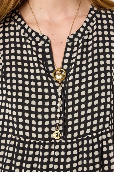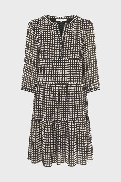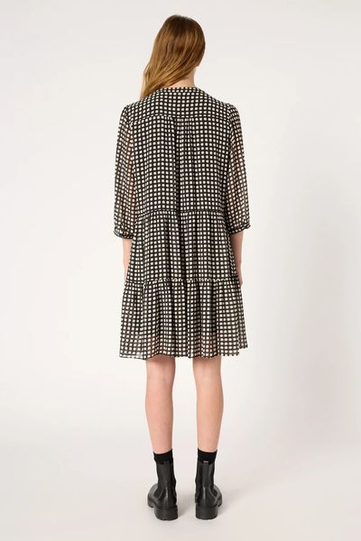 Short dress with white polka dots on a black background in a graphic style. It is crafted from polyester Georgette, slightly pleated with a fluid drape.