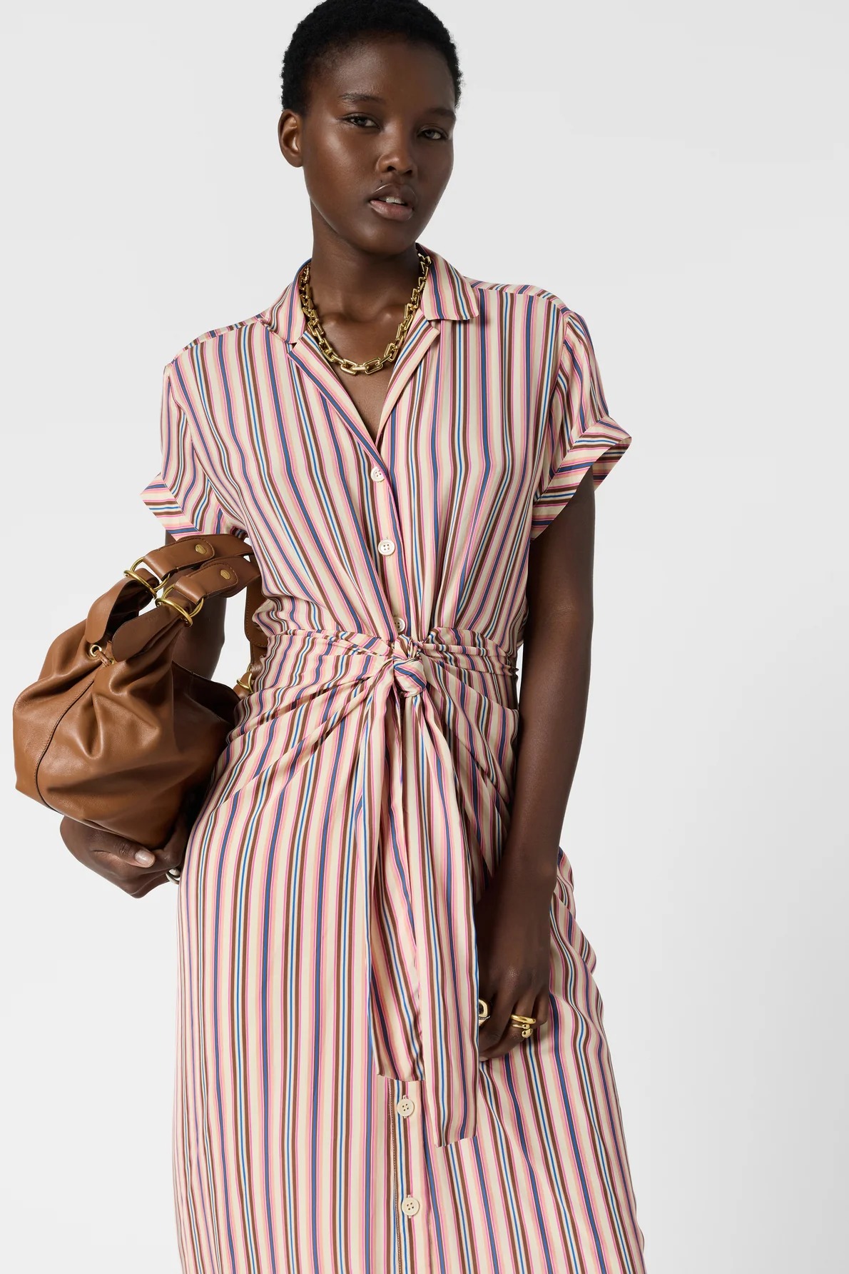 A delightfully retro spirit for this multicolored striped shirt dress, featuring short sleeves and a waist cinched with a knot. Graphic and feminine, it offers a chic, effortless style; ideal for a summer in the city or countryside. It is crafted from a fine fabric with subtle transparency.